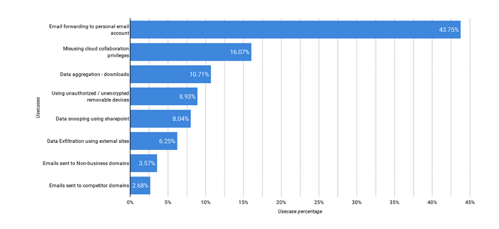 其中有 43.7% 的内部人员将资料转发到了个人电子邮箱、16% 的人滥用了云协作特权、10% 的人下载了聚合数据,以及通过未未经授权的 USB 和可移动存储介质来拷走数据。