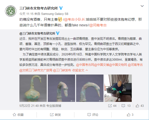 微博认证为“河南省文物考古研究院 考古发掘队领队 知名历史博主”的@考古小队长表示,不要对那些液体抱有幻想,那些说什么几千年酒香扑鼻的,都是fake news。