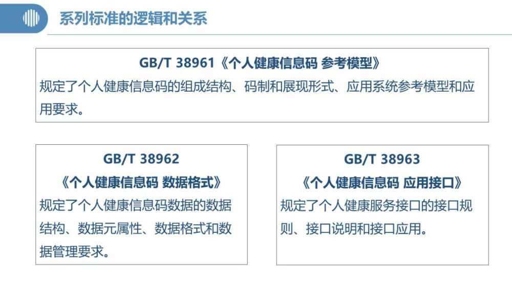 据了解,健康码“国标”由《参考模型》《数据格式》和《应用接口》三项标准构成。总体上来看,《参考模型》是框架性标准,重在提出“健康码”应用系统和系统间互认的技术模型;《数据格式》规范了个人健康信息数据,重点在数据“原料”层面下功夫;《应用接口》则可看作是框架模型下实现系统对接互认的操作指导手册。三项标准互为支撑和补充,共同适用于指导“健康码”系统的设计、开发和系统集成。