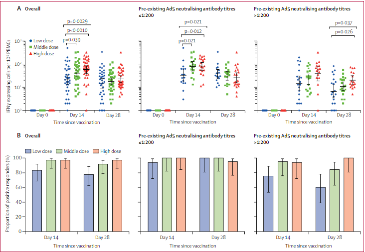 根据论文,这项研究是在 108 名健康成年人中进行的开放标签试验,对以腺病毒 Ad5 为载体的新冠疫苗进行评估:在接种疫苗后的第 14 天开始就发现了快速的特异性 T 细胞反应,并在第 28 天对 SARS-CoV-2 的体液免疫反应达到高峰,且未发现严重不良事件。