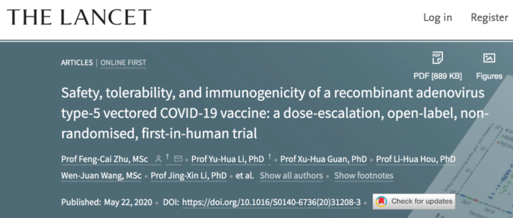 在新冠疫苗的研发上,中国的科研团队再一次迈出了重要的一步。5 月 22 日晚间,国际学术期刊《柳叶刀》(The Lancet)在线刊登了由中国工程院院士陈薇团队研发的新冠病毒疫苗。结果显示,疫苗安全性良好,并在志愿者体内成功产生抗体。