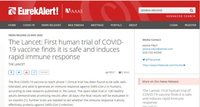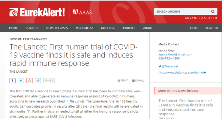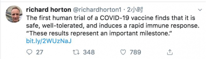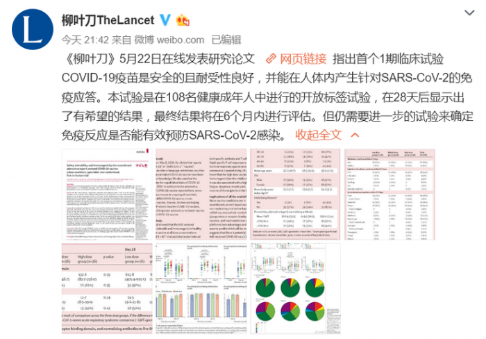 《柳叶刀》也通过其官方微博称:首个 1 期临床试验 COVID-19 疫苗是安全的且耐受性良好,并能在人体内产生针对 SARS-CoV-2 的免疫应答。本试验是在 108 名健康成年人中进行的开放标签试验,在 28 天后显示出了有希望的结果,最终结果将在 6 个月内进行评估。但仍需要进一步的试验来确定免疫反应是否能有效预防 SARS-CoV-2 感染。