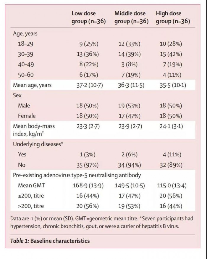 在 2020 年 3 月 16 日至 3 月 27 日期间,研究小组筛选了 195 名志愿者,其中 108 人( 51% 为男性,49% 为女性;平均年龄 36.3 岁)被招募并被分配到三个剂量组——低剂量组(5 x 1010)、中剂量组(1 x 1011)以及高剂量组(1.5 x 1011)。