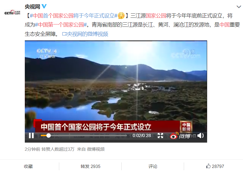 2018年1月,国家发改委公布《三江源国家公园总体规划》,明确至2020年正式设立三江源国家公园。