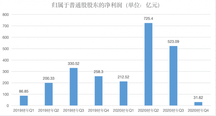 在 2020 财年 Q4 季度,阿里总营收为 1143 亿元,同比增长 22%,高于此前市场预期。但其归属于普通股股东的净利润却出现断崖式下滑,仅为 31.62 亿元,同比下滑超过 80%,为过去两年的最低值。