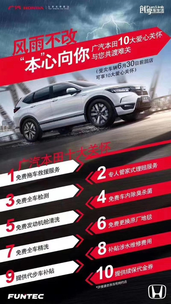 不过,让众多本田车主感到暖心的是,受暴雨突袭,导致车辆被泡水,广汽本田官方特推出了10项受灾车辆的关怀服务,给消费者提供可靠的防护修复。