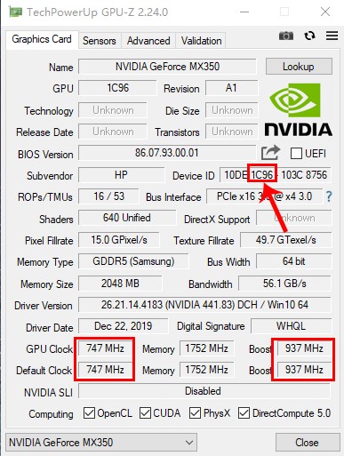 非满血版MX350独显时钟频率747MHz,Boost频率937MHz;