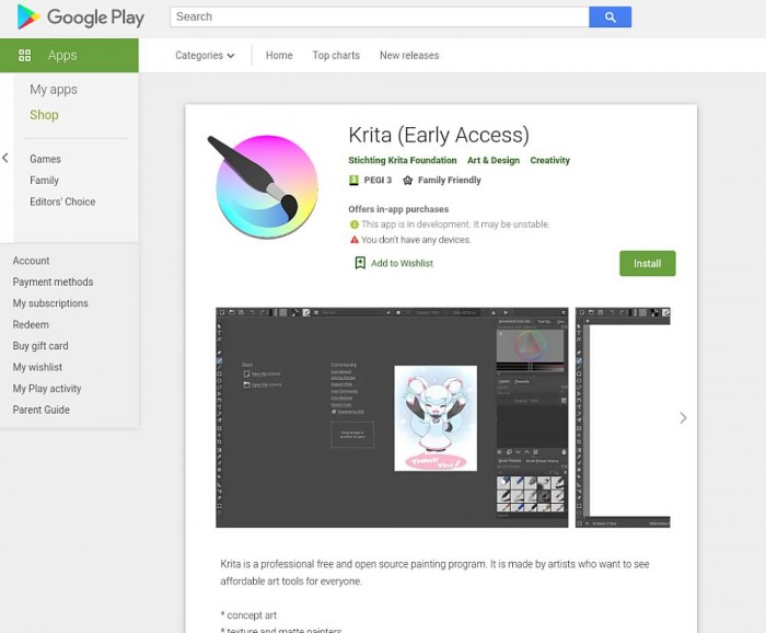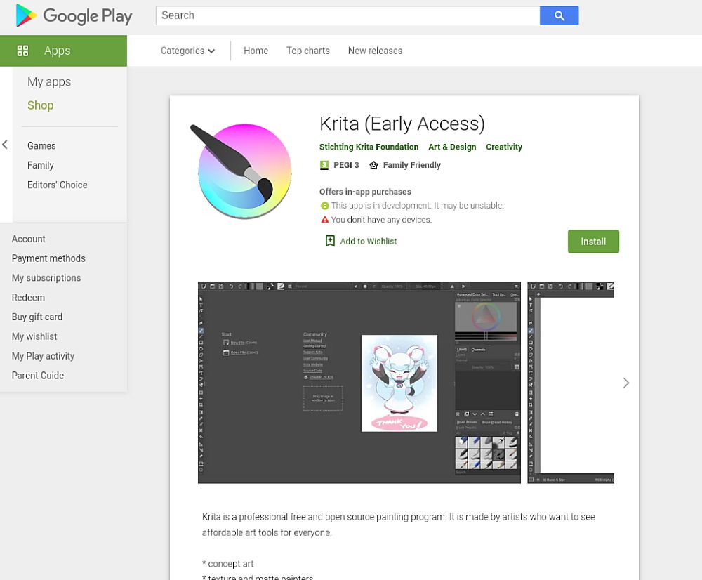 官方更新日志中表示:“由于 Play Store 是许多安卓用户获取 Krita 的唯一途径,我们不会和 Microsoft Store 和 Steam 版本那样进行收费。如果你想要支持 Krita,也可以在 Play Store 的 Krita 页面购买支持者勋章 (supporter badge) 。”
