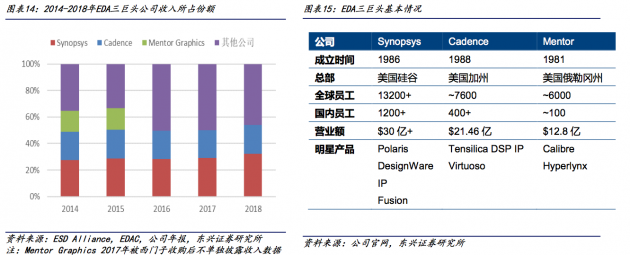 东兴证券研究所给出的数据显示,美国的Synopsys、美国的Cadence和西门子旗下的Mentor Graphics全球市场的份额超过60%。其中,Synopsys是全球最大的EDA企业,2018年的市场份额已达到32.1%;Cadence仅次于Synopsys,2018年市场占有率为22.0%;Mentor Graphics在被收购之前也能保持超过10%的市场占有率。