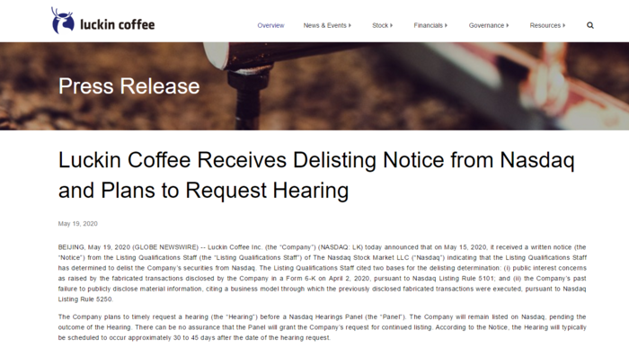 与此同时,我们也从瑞幸咖啡的官网上了解到,公司已于5月15日收到了纳斯达克上市资格部门的书面通知,纳斯达克交易所决定将其摘牌。对此瑞幸方面表示,公司计划举行听证会。在听证会结果公布之前,公司将继续在纳斯达克上市,但不能保证专家组会同意公司继续上市的要求。从股票停牌,CEO下课,高层大换血,(坚持)持续补贴,再到门店“关停并转”,这一系列的动作不由得让人猜想,瑞幸咖啡正在努力“自救”。