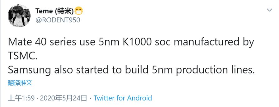 5月24日消息,爆料人RODENT950推特透露,华为下一代旗舰芯片名为麒麟1000,它基于5nm工艺打造,由Mate 40系列首发。据业内人士爆料,麒麟1000代号为“巴尔的摩”,它采用5nm工艺制程,有可能会采用Cortex A78架构,CPU、GPU会有较大提升,Mate 40系列将是首发机型。