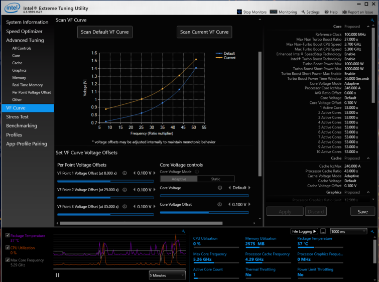 此外,十代酷睿中针对桌面端而加入的新版本 Extreme Tuning Utility ,除了能将 CPU 当前状态以图表的形式展示出来,还能针对显卡的表现进行调整,甚至还可以手动将部分核心锁频,在固定功耗下,让几颗核心更高频的运行;有这种软件优化,专业玩家可以在自己装机后,根据自己的日常游戏运行需求与习惯,辅以台式机中新散热模组与高性能显卡的加持;释放出主机更具适应性的性能发挥。