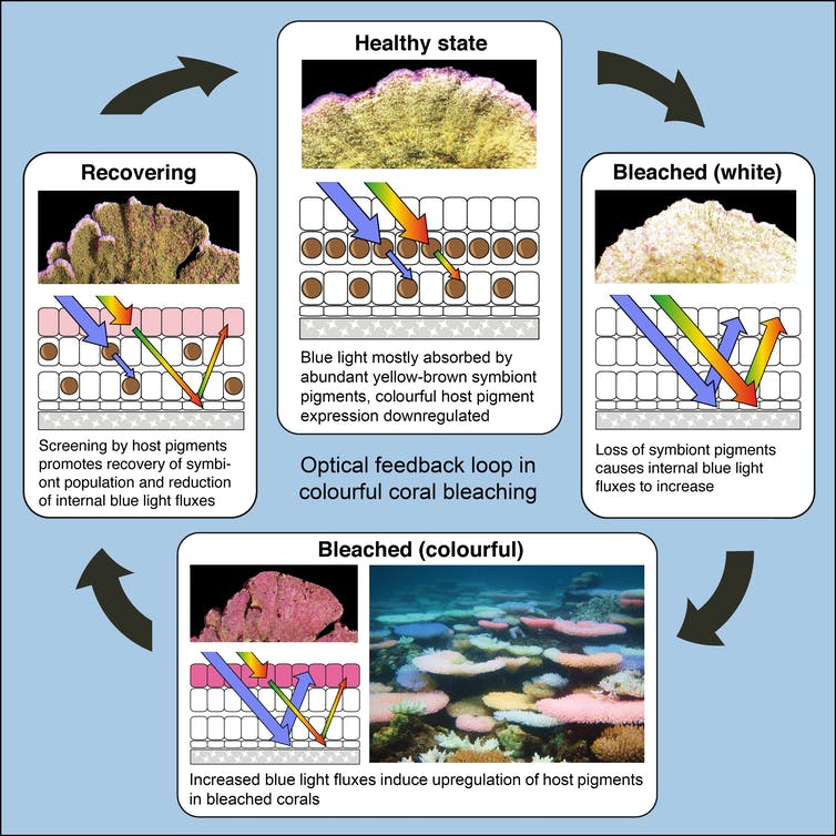 “在健康的珊瑚中,大部分的阳光都被藻类的光合色素吸收了,”研究人员解释说。“当珊瑚因压力而失去藻类时,多余的光线会在珊瑚组织内部来回流动,由白色骨架反射。一旦条件恢复正常,珊瑚内部的藻类在白化后可以恢复。但当珊瑚内部被这样的光照亮时,会给藻类带来很大的压力,可能会延迟甚至阻止它们的恢复。”