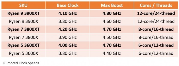 日前有消息称,AMD将会推出锐龙3000XT系列处理器,作为现有锐龙3000X的升级版,包括至少三款型号:锐龙9 3900XT、锐龙7 3800XT、锐龙5 3600XT。最新曝料终于给出了它们的具体规格,不出所料都是进一步提升了频率: