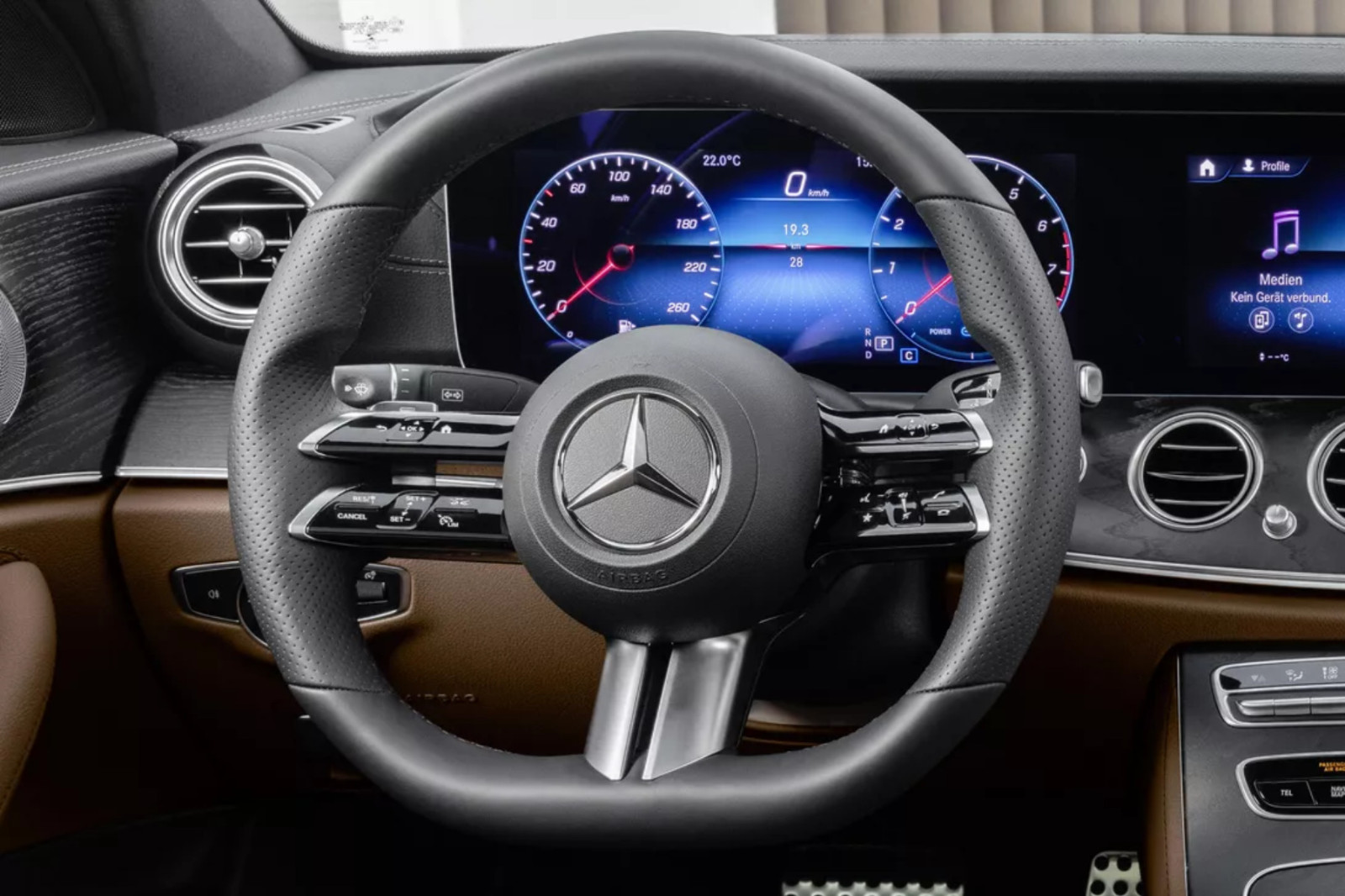 从奔驰公布的图片不难发现,E级车采用的新方向盘做了一个不小的调整--首先是,方向盘的按钮辐条从原先的单层变成了双层设计,然后是下方的辐条也变成了两条设计。