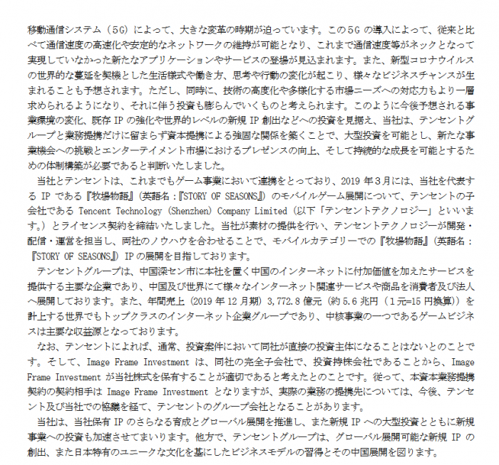 Marvelous官方还表示:“我们与腾讯公司一直有着业务上的往来,腾讯也曾与我们共同开发《牧场物语》移动版游戏。腾讯全资子公司Image Frame Investment将成为资本和商业联盟合作伙伴。”