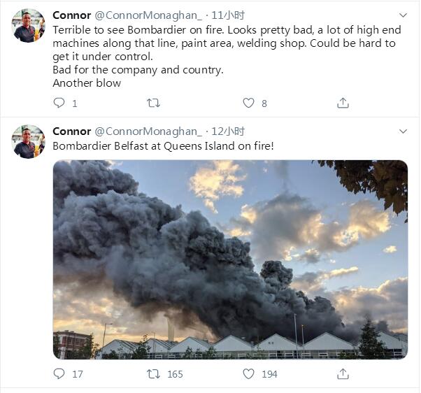 据海外社交平台网友爆料,北爱尔兰当地时间5月24日晚上8点半左右,加拿大航空器制造商庞巴迪位于北爱尔兰贝尔法斯特的工厂发生大火。截止发稿,庞巴迪方面尚未通报起火原因及损失情况。