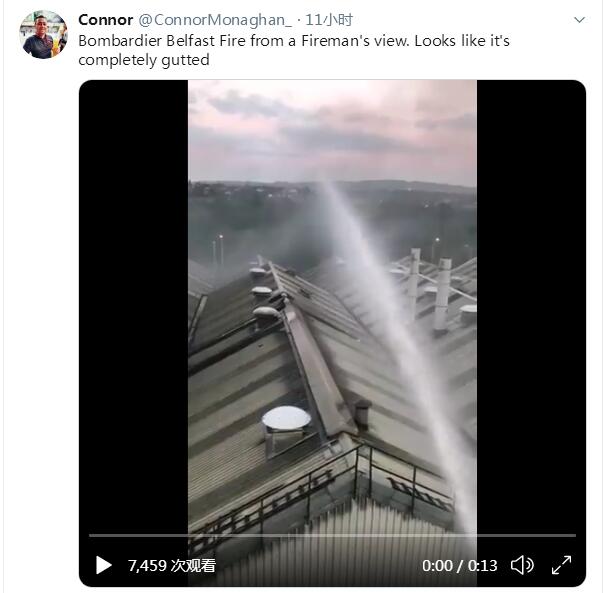 北爱尔兰当地时间24日晚,ID名为“Connor”的网友通过境外社交平台曝光一张照片及一段短视频,根据曝光内容所示,庞巴迪的北爱尔兰贝尔法斯特工厂被浓烟包裹,顶棚可见明显的焚烧痕迹,多辆消防车在现场进行扑救行动。