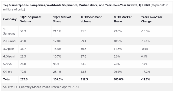 来自市场调研机构 IDC 的数据显示,2020 年第一季度,在全球智能手机市场,华为智能手机的出货量为 4900 万部,比去年同期下降了 17.1%——虽然依旧排名第二,但外界普遍认为,华为的出货量下滑与 GMS 的缺失有关。