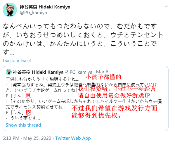 ·根据毒舌直男神谷英树本次的发言来看,似乎是又收到了不知谁的吐槽而显得很不耐烦来澄清:说了多少遍了总是不明白,再次重申一下,鄙社和腾讯的关系就如同下文所示: