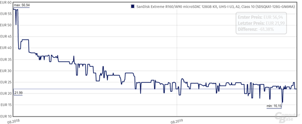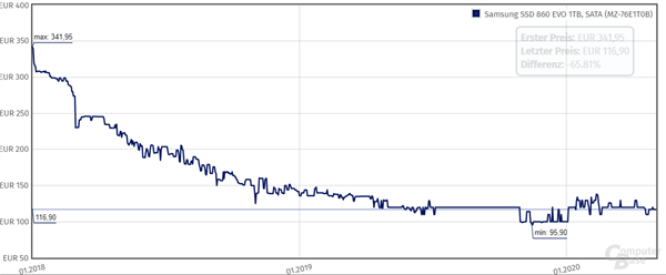 德国Computerbase网站日前以美光MX500、三星860 EVO及闪迪128GB存储卡为例分析了这两年来SSD及存储卡的价格走势,如下所示: