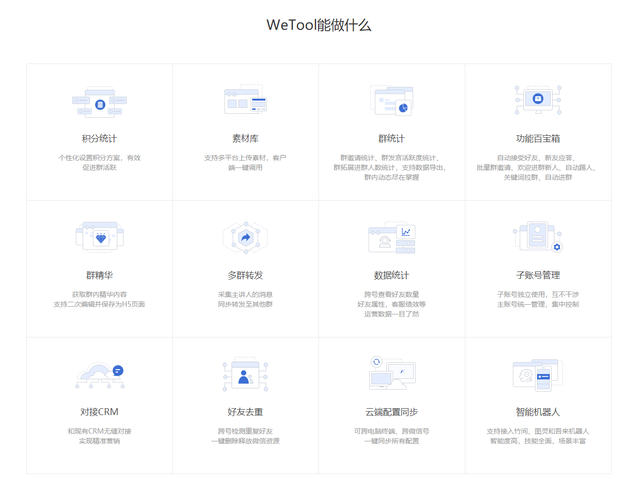Wetool是一个微信社群管理工具,从官网上介绍来看,它的功能比原始版微信强太多了,支持群统计、自动接受好友、批量群邀请、自动踢人、多群转发、好友去重、智能机器人等等,如果是做微商或者微信营销的,这个软件绝对好用,而且还有更高级的企业版,功能更多,当然会收费。