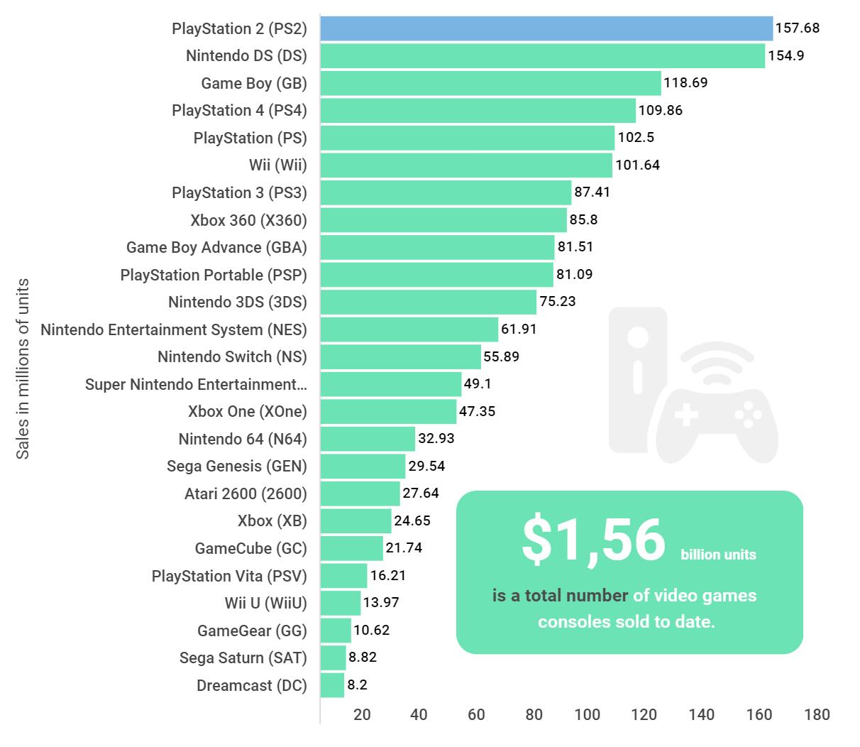现在是2020年了,视频游戏已经无处不在。而像PS4和Xbox One这样的主机主机继续发动平台大战。然而,全球售出了多少主机?显然,截止至2020年3月底,全球共售出15.6亿台游戏机。这一最新数据来自LearnBonds.com网站,该网站研究了全球主机的销售情况。然而尽管已经过去了这么多年,索尼的PS2仍然在所有平台中占据主导地位。