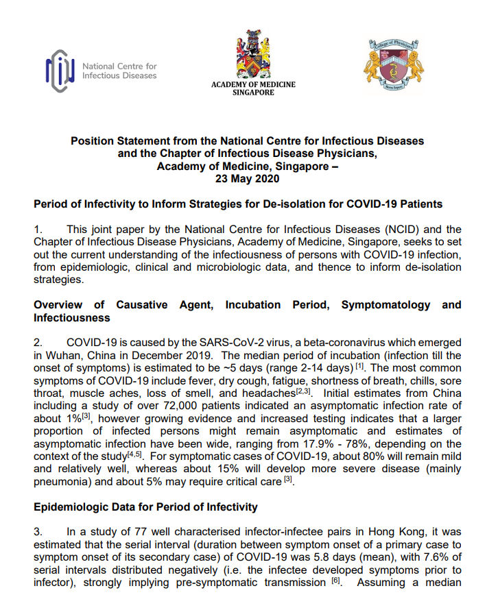 新加坡的论文还引用了一项来自德国的研究来支持其研究结果。德国的研究人员发现,患者在出现症状的第一周内具有高度传染性。研究人员指出:“在症状的第一周,从喉咙和肺部标本中培养出感染性病毒,尽管通过常规PCR检测到的病毒载量很高,但在第8天后,没有一个感染性病毒。”