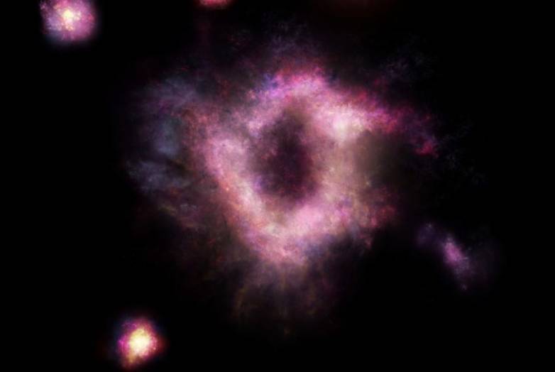 据外媒BGR报道,科学家们发现了一个甜甜圈状的星系,隐藏在离地球110亿光年之外。这个星系正在以惊人的速度制造恒星。研究人员相信它的形状是由于与另一个星系的碰撞而形成的。相关研究成果最近发表在《自然-天文学》杂志上。