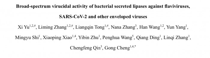 当地时间5月22日,研究团队在预印本网站bioRxiv在线发表了上述研究,题为“Broad-spectrum virucidal activity of bacterial secreted lipases against flaviviruses, SARS-CoV-2 and other enveloped viruses”。论文的通讯作者为清华大学医学院程功教授。