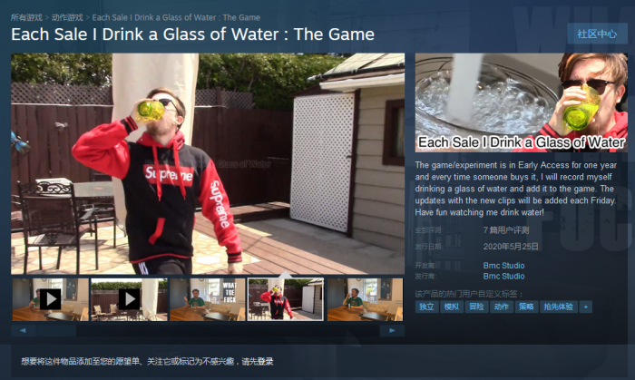 2020年4月20日,我们报道了“一款奇葩游戏上架Steam:卖出一份就喝一杯水?”的相关消息。这款游戏曾经因为“互动性不足”而被Steam下架。5月25日,这款游戏又在Steam平台上架,还开启了抢先体验模式(这一回,开发者在该奇葩作品中加入了小游戏)。