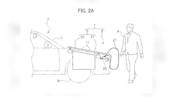 具体来看,从专利图可知,车辆前部配备有传感器,可以识别探测前方物体,如果检测到即将碰撞到行人或者自行车、摩托车时,会在碰撞之前,主动爆开气囊,减轻对方的人身伤害。