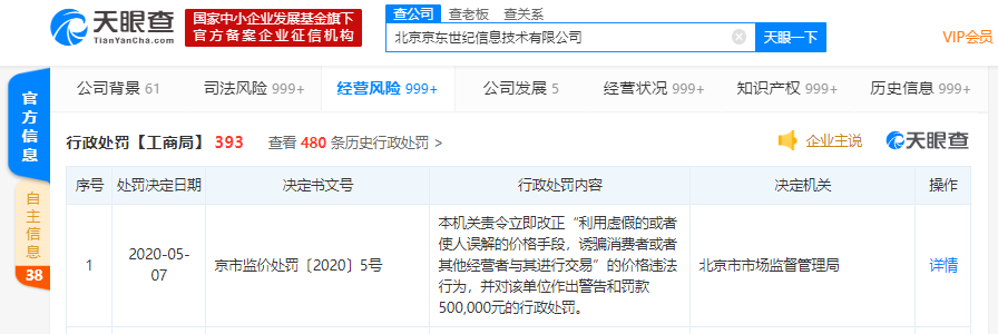 天眼查数据显示,近日,北京京东世纪信息技术有限公司新增行政处罚信息一条,决定机关为北京市市场监督管理局,行政处罚内容为本机关责令立即改正“利用虚假的或者使人误解的价格手段,诱骗消费者或者其他经营者与其进行交易”的价格违法行为,并对该单位作出警告和罚款500,000元的行政处罚。