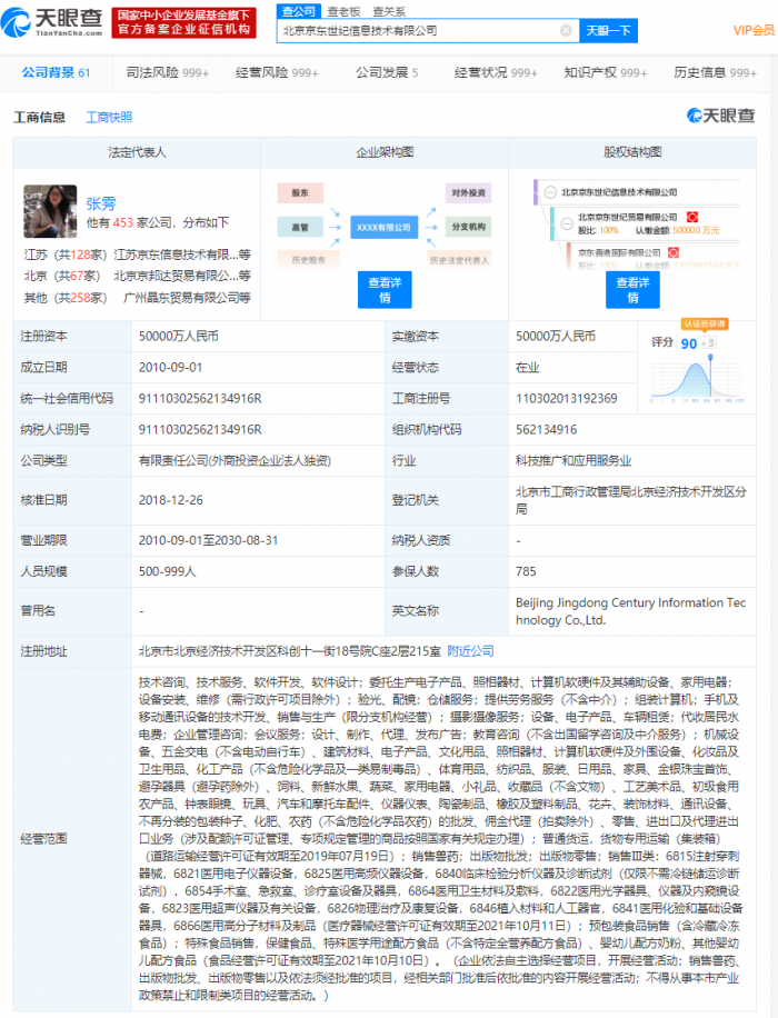 北京京东世纪信息技术有限公司成立于2010年9月,注册资本5亿人民币,法定代表人为张雱,公司经营范围包括计算机软硬件及外围设备、体育用品、纺织品、服装、日用品的批发、佣金代理(拍卖除外)、零售、进出口及代理进出口业务;普通货运,货物专用运输(集装箱);出版物批发;出版物零售等,该公司由北京京东世纪贸易有限公司全资控股。