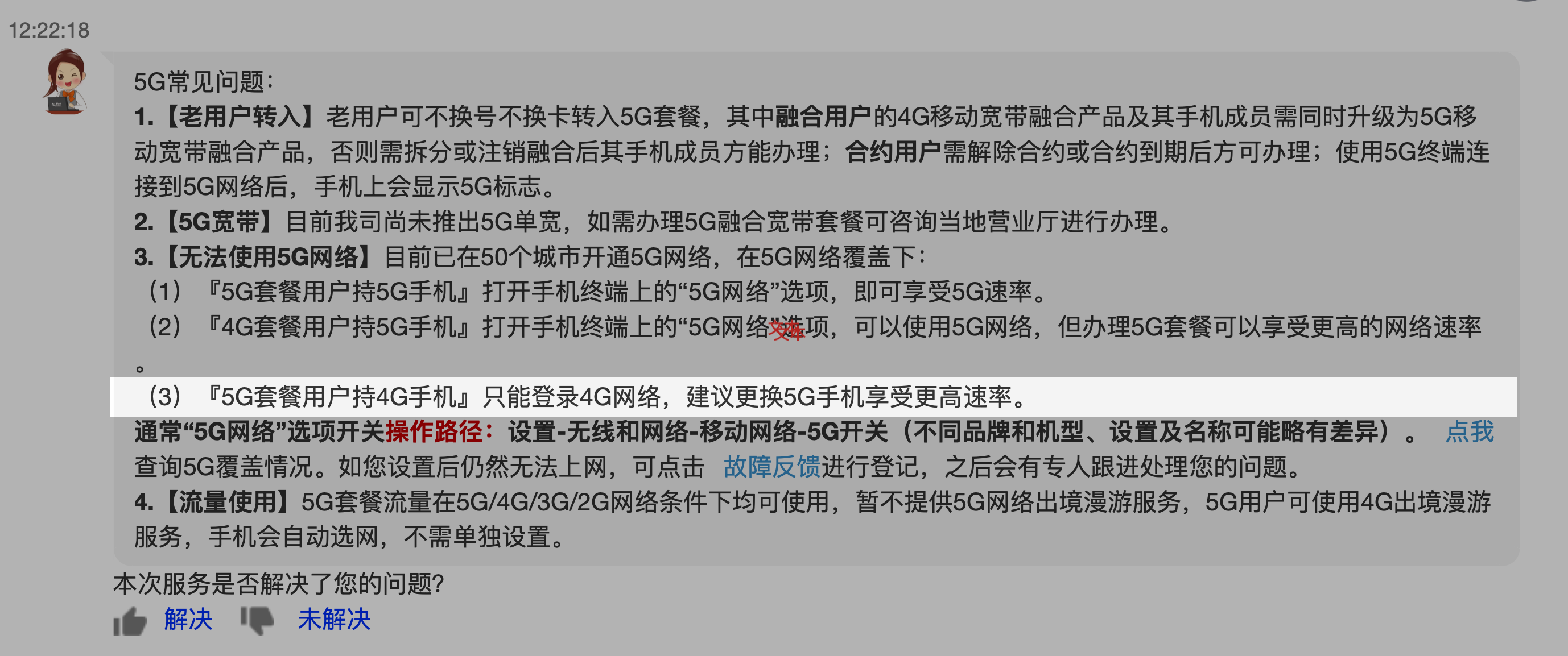 和累积售出的近 2400 万部 5G 手机一比较,就能够发现其实有超过一半的 5G 套餐用户用的依旧是 4G 手机,这些“假 5G”用户往往无法体验到真正的 5G 网速。根据中国联通的客服介绍:“5G 套餐用户持 4G 手机只能登录 4G 网络,享受的依旧是 4G 套餐速(最高 300Mbps 的下行速度)。”