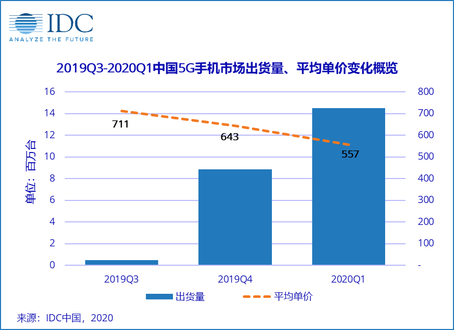 IDC 表示,国内的 5G 手机单价正在迅速下探,去年第三季度的平均单价为 711 美元,而今年第一季度已经跌破 600 美元,录得 557 美元的历史新低。