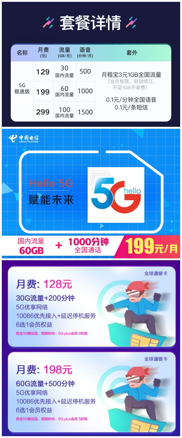 以中国移动为例,目前其推出的“5G 智享套餐(个人版)”中分为多个价格档位,价格最低的为 128 元,订购的用户能够享受 30G 流量+200 分钟通话时长的权益,中国联通的“5G 王卡”中最便宜的也差不多是 130 元,同样享受 30GB 流量和一定的通话时长。