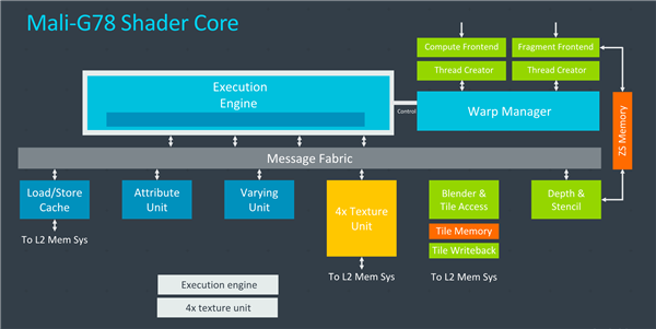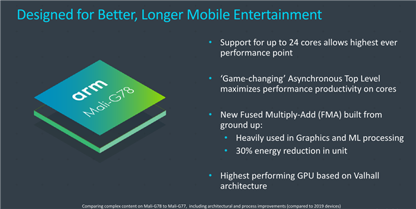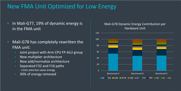 另外,Mali-G78彻底重写了FMA(融合乘加)引擎,包括新的乘法架构、新的加法架构、FP32/FP16浮点,可以节省30%的功耗。