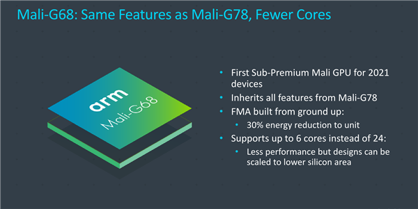 Mali-G68则是首款次旗舰级GPU,显然定位于Mali-G70系列、Mali-G50系列中间,架构、特性完全沿袭Mali-G78,唯一区别就是最多只能支持6个核心。
