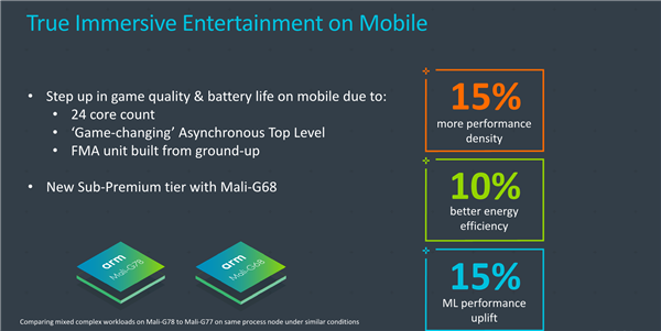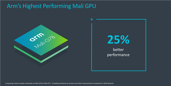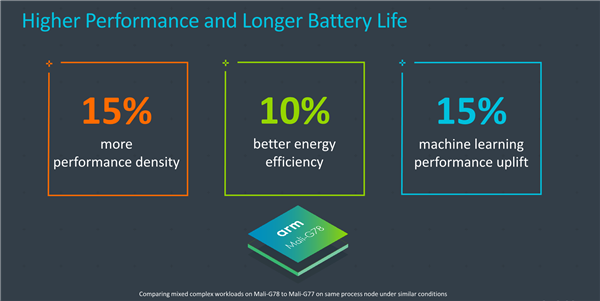 ARM宣称,综合架构、工艺等各方面的改进,Mali-G78相比于Mali-G77的性能提升幅度可达25%,即便是在同等工艺条件下也可提升15%, 同时能效提升10%,机器学习性能提升15%。