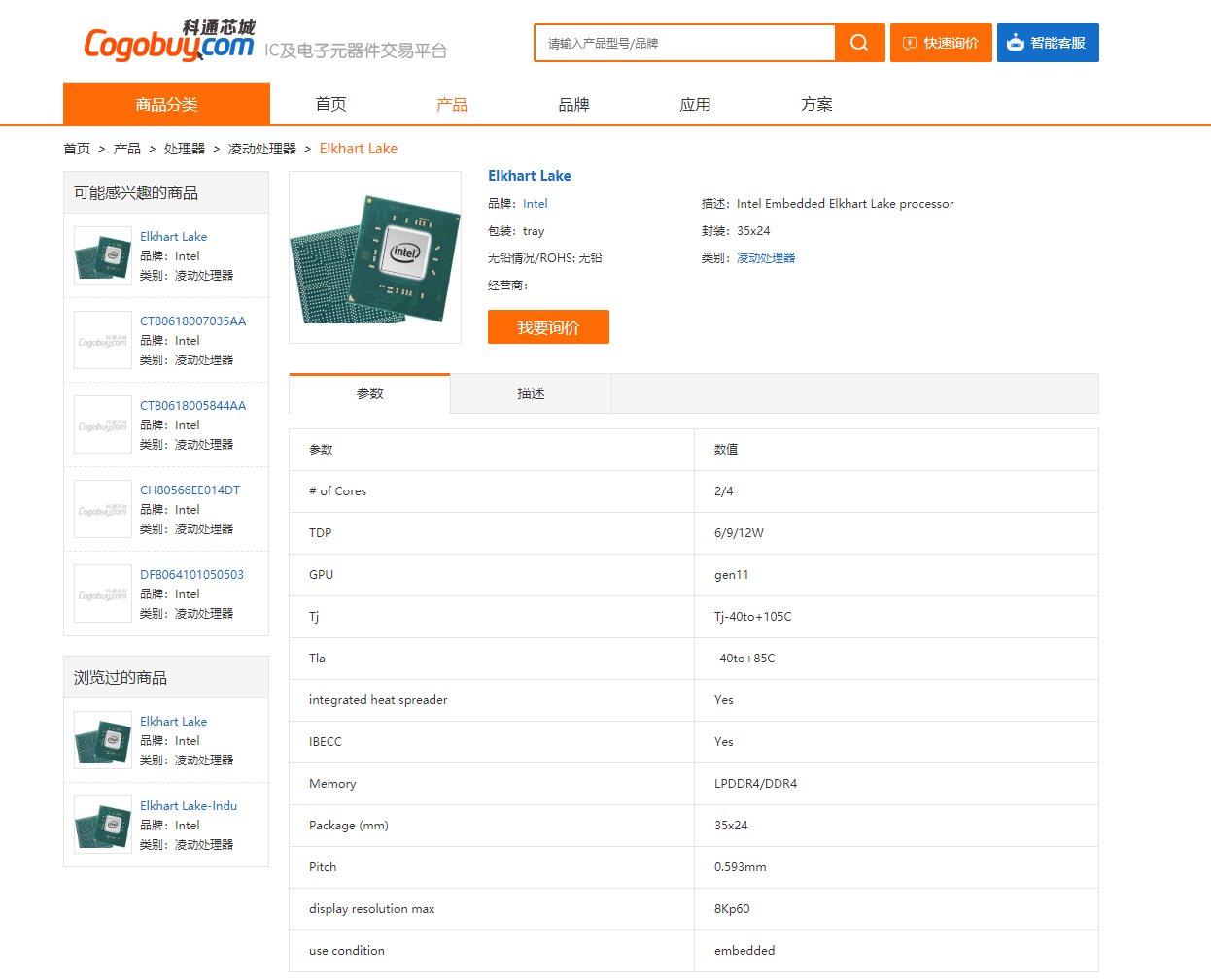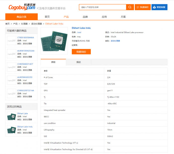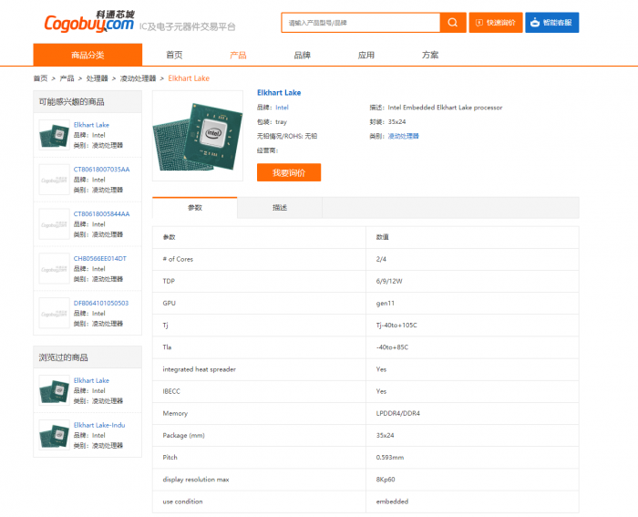 IC及电子元器件交易平台科通芯城上,Elkhart Lake处理器已经被公然拿出来叫卖,制造工艺又标注着10nm,这么一来可就相当混乱了,虽然不排除商家标注错误的可能性,但是其他参数又都有模有样。