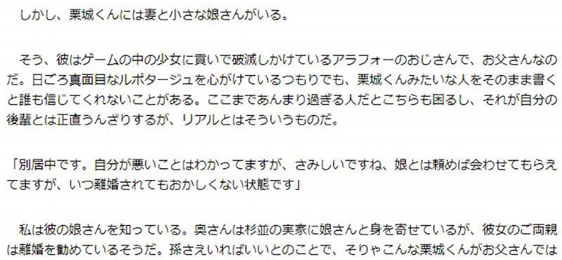 “栗城以前就曾经玩柏青嫂玩到破产,当时他的公司有负责写柏青嫂的介绍,栗城碰巧被派去这个职务,结果自己深陷其中……”