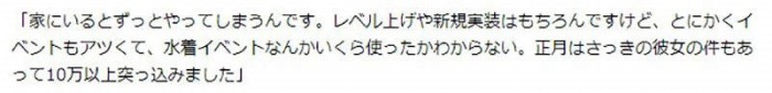 “我在家就一直玩,有新卡当然就抽,有活动也很投入,泳装活动花了多少钱都数不清了。新年也砸了10万以上”