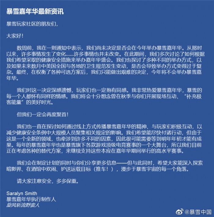 暴雪娱乐宣布,今年的暴雪嘉年华将停办。这项活动通常在十一月初举行。暴雪的执行制作人Saralyn Smith表示:“我们已经讨论过很多次了,考虑到健康和安全方面的问题,举办这样的大型活动会造成怎样的后果。”