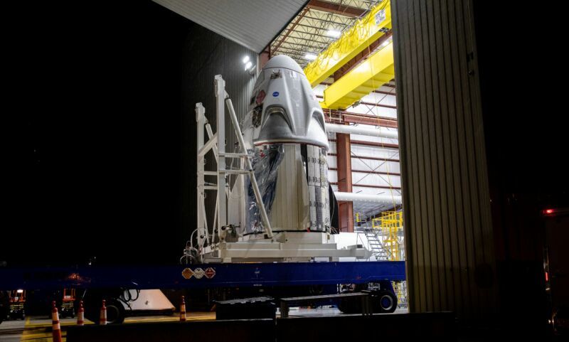 图:SpaceX载人龙飞船正在佛罗里达州肯尼迪航天中心39A发射台上蓄势待发