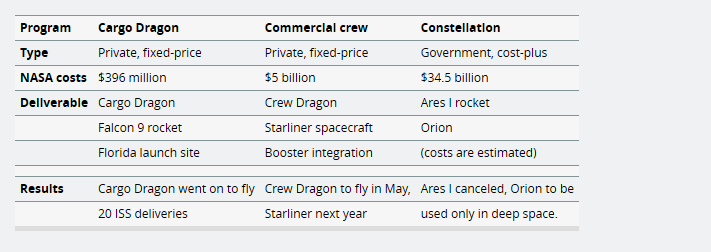在NASA的商业供应商中,SpaceX取得的成就最大。在货运方面,它以更少的成本执行了更多的任务。作为载人飞行计划中,NASA付给波音公司的钱比SpaceX多50%。尽管如此,SpaceX仍比波音提前一年完成了载人龙飞船项目,而波音最早也要到明年春天才能完成载人飞行。反过来,SpaceX也从与NASA的合作中获得了巨大好处,无论是在经济上还是在安全载人飞行技术上。