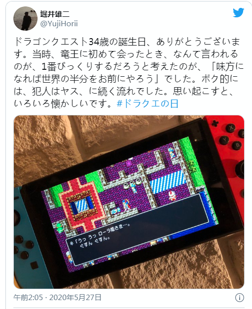 ·堀井雄二回忆《勇者斗恶龙》诞生之初,感想万千:今天是《勇者斗恶龙》34岁生日,感谢。回想当初,与龙王初次对峙之时,最吃惊的是龙王的话“加入吾王!五必分半壁世界于你”,时至今日依然记忆犹新。