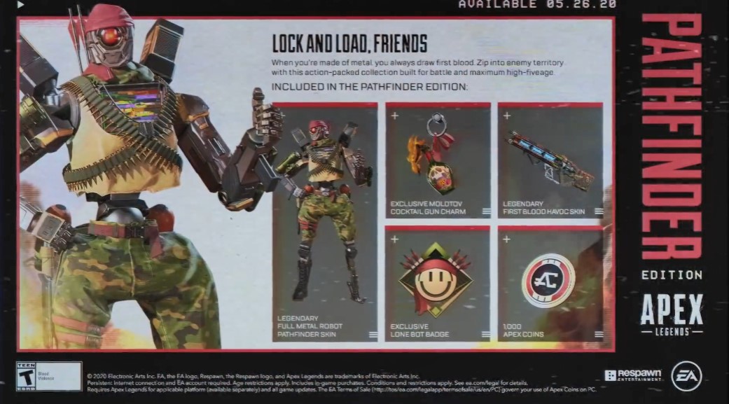 今日(5月26日),《Apex英雄》官方油管频道公布了新的“探路者传奇皮肤包”预览视频,新的“探路者传奇皮肤包”包括:“全金属机器人”探路者皮肤、“第一滴血”哈沃克步枪皮肤、“燃烧瓶”护身符、特殊徽章以及1000Apex金币。目前,《Apex英雄》“探路者传奇皮肤包”已上架PlayStation商城、Xbox Live和Origin平台。