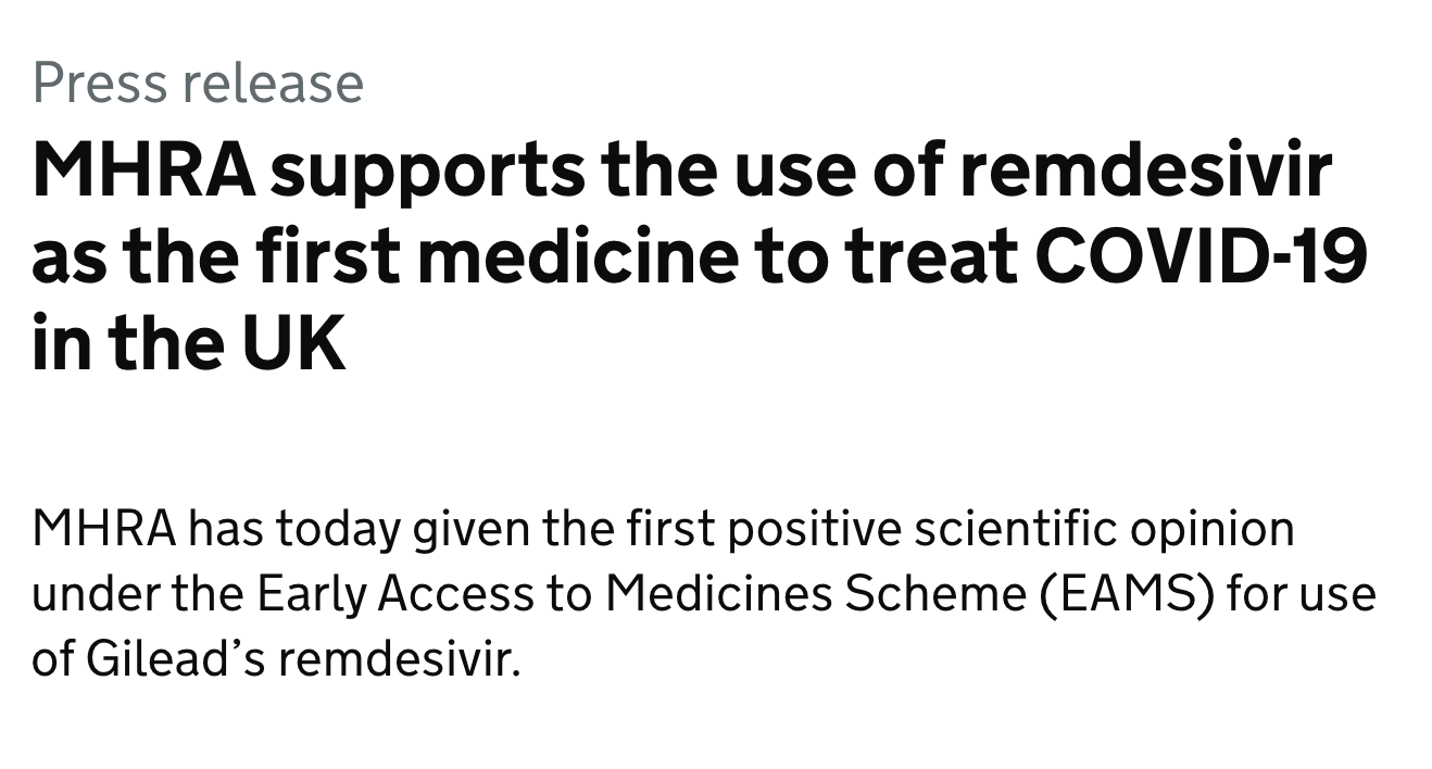 英国药品和保健产品监管机构(MHRA)当天在官网公布的信息显示,MHRA依照“药品早期获得计划(EAMS)”对瑞德西韦的使用给予了积极的科学意见(scientific opinion),此步骤将支持瑞德西韦用于治疗新冠肺炎病情严重的患者,包括成年人和青少年。
