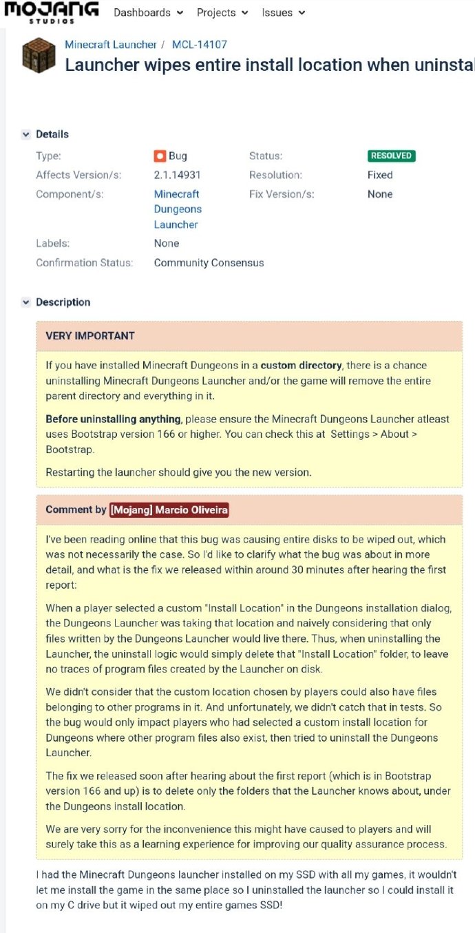 有国外玩家在官方论坛上反映,用Windows自带的添加和删除程序卸载游戏,会导致SSD被全盘清空。Mojang工作室表示,玩家可以打开启动器设置选项,在关于中查看“bootstrap”,如果版本是166或者更高,那就可以安全卸载。